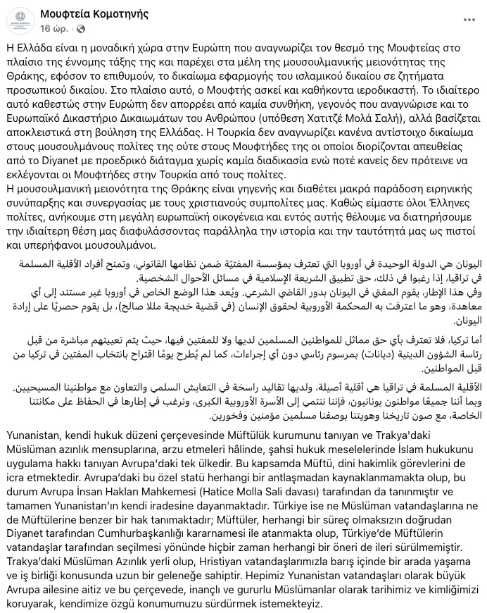 Απάντηση Μουφτείας Κομοτηνής στην Άγκυρα: Η Ελλάδα αναγνωρίζει θεσμικά τη Μουφτεία, σε αντίθεση με την Τουρκία