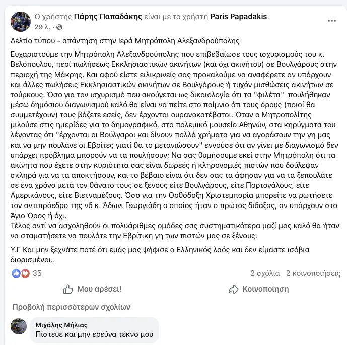 “Ευχαριστούμε την Μητρόπολη Αλεξανδρούπολης που επιβεβαίωσε τους ισχυρισμούς του κ. Βελόπουλου, περί πωλήσεως Εκκλησιαστικών ακινήτων (και όχι ακινήτου) σε Βουλγάρους στην περιοχή της Μάκρης. Και αφού είστε ειλικρινείς σας προκαλούμε να αναφέρετε αν υπάρχουν και άλλες πωλήσεις Εκκλησιαστικών ακινήτων σε Βουλγάρους ή τυχόν μισθώσεις ακινήτων σε Τούρκους.