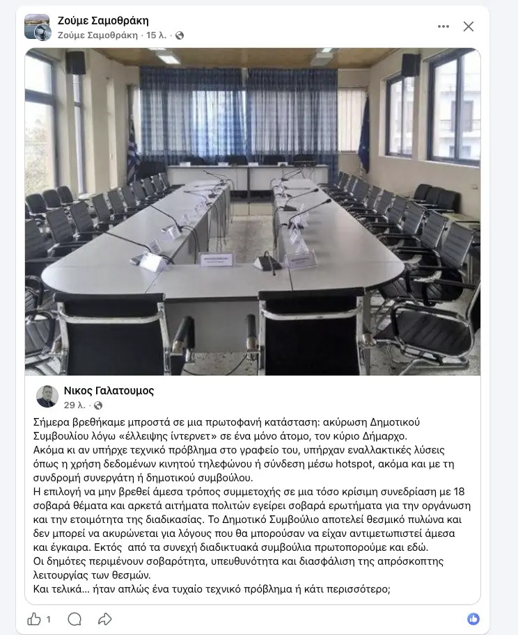 Στην ακύρωση προγραμματισμένης συνεδρίασης του Δημοτικού Συμβουλίου οδήγησε τεχνικό πρόβλημα σύνδεσης στο διαδίκτυο που αφορούσε τον Δήμαρχο, σύμφωνα με καταγγελία του Νίκου Γαλατούμου.