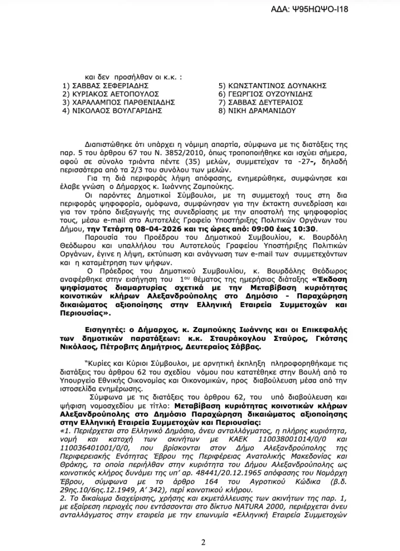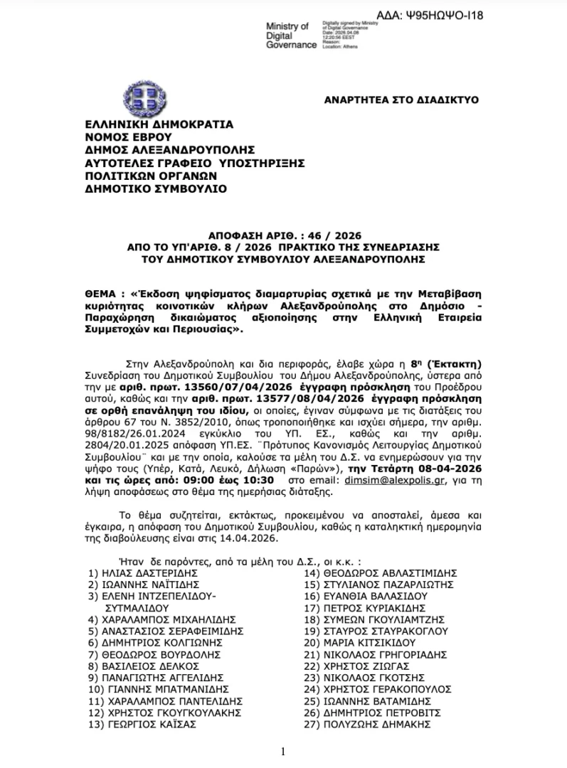 Ομόφωνο ψήφισμα διαμαρτυρίας ενάντια στη μεταβίβαση δημοτικής περιουσίας στο Ελληνικό Δημόσιο εξέδωσε το Δημοτικό Συμβούλιο Αλεξανδρούπολης, κατά την έκτακτη συνεδρίασή του στις 8 Απριλίου 2026.