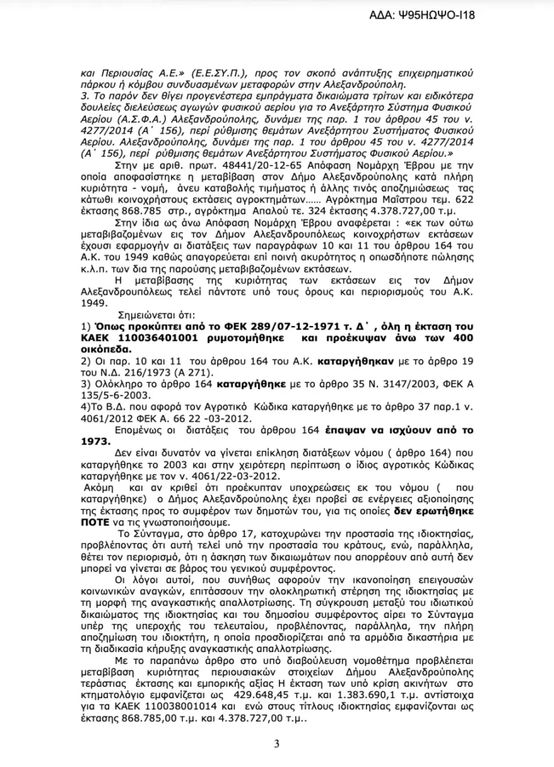 - Εναλλακτικά, την προβλεπόμενη νόμιμη αποζημίωση για την έκταση ή την ανταλλαγή της με τη Δυτική χερσαία ζώνη του λιμένα Αλεξανδρούπολης και το Πάρκο του πρώην Ε.Ο.Τ..