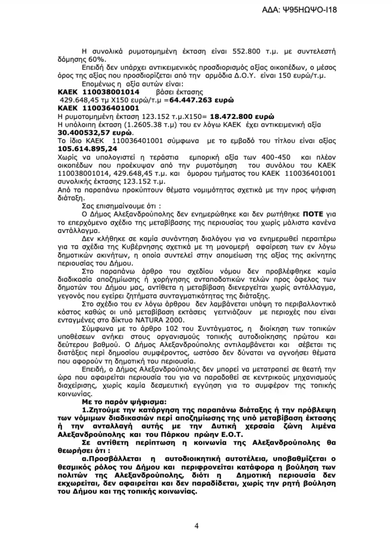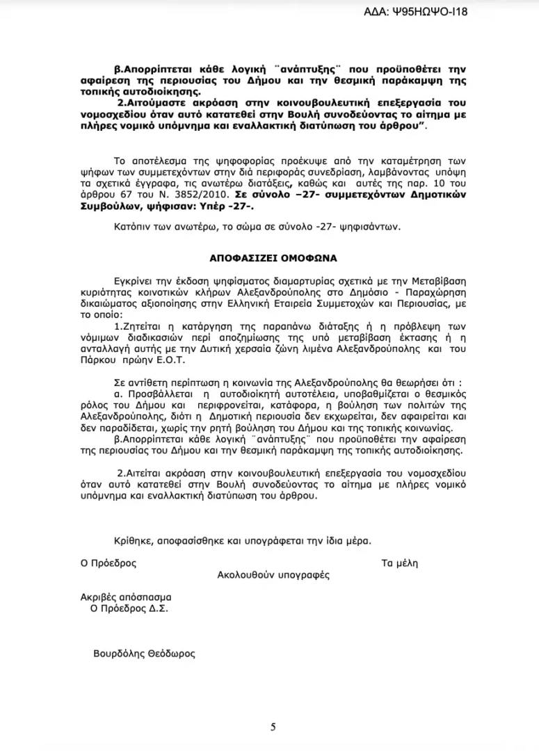 Το Δημοτικό Συμβούλιο ξεκαθαρίζει σε απόλυτο τόνο πως η μονομερής αφαίρεση της δημοτικής περιουσίας προσβάλλει την αυτοδιοικητική αυτοτέλεια, παρακάμπτει θεσμικά τον Δήμο και περιφρονεί κατάφορα τη βούληση των πολιτών της Αλεξανδρούπολης.